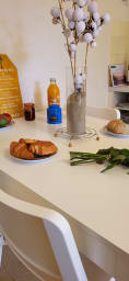 Côté cuisine : ouverte sur le séjour, (Plaque induction, micro-ondes, frigidaire, lave-linge Cafetière Tassimo, grille pain et bouilloire avec une table pour 4 personnes qui vous permettra d'accueillir vos repas et convives. * Animal sur demande Supplément 30 euros*
