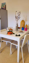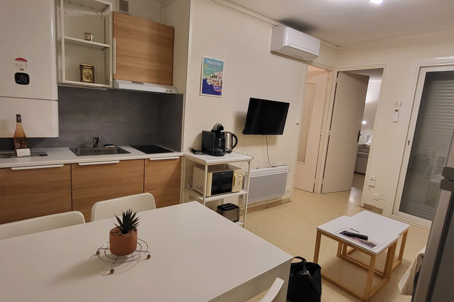 Le Logement : cet appartement de type 2, 1 chambre à 200 m de la Plage du centre ville quartier de la Mairie du Grau du Roi , idéal pour 2 personnes, rénové et confortable (cuisine équipé, plaque induction, cafetière Tassimo, bouilloire grille pains, Climatisation, double vitrage, salle de douche).
