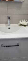 Salle de douche, large vasque avec meubles à tiroirs, et toilette.