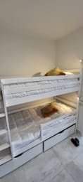 Coté cabine : 1 Lit superposé (2 petits lits en 90) pour enfants ou jeune adulescents , Oreillers rectangulaire 70x50, Couette, pour enfants et adolescents. kit draps et serviettes vous seront amenés sur réservation à 20 euros pour 2 personnes