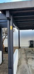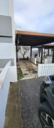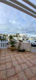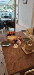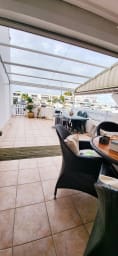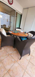 Extérieur : Terrasse aménagée pour les repas face au port.